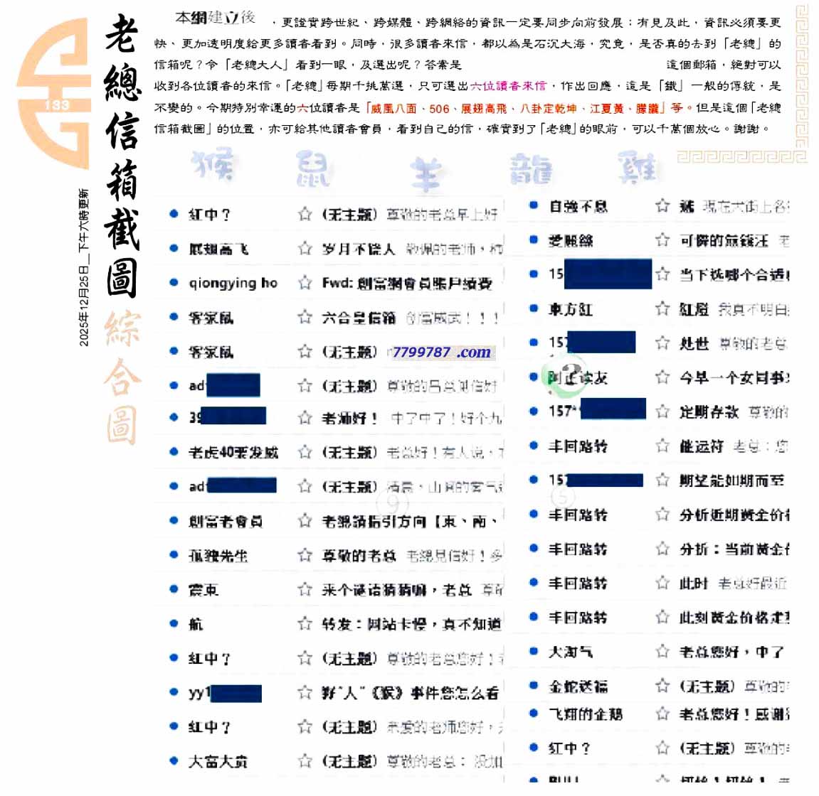 | 主题 :133期:六合皇金句/老总论码/萧公子/林大师/五行夺码/老总信箱截 |