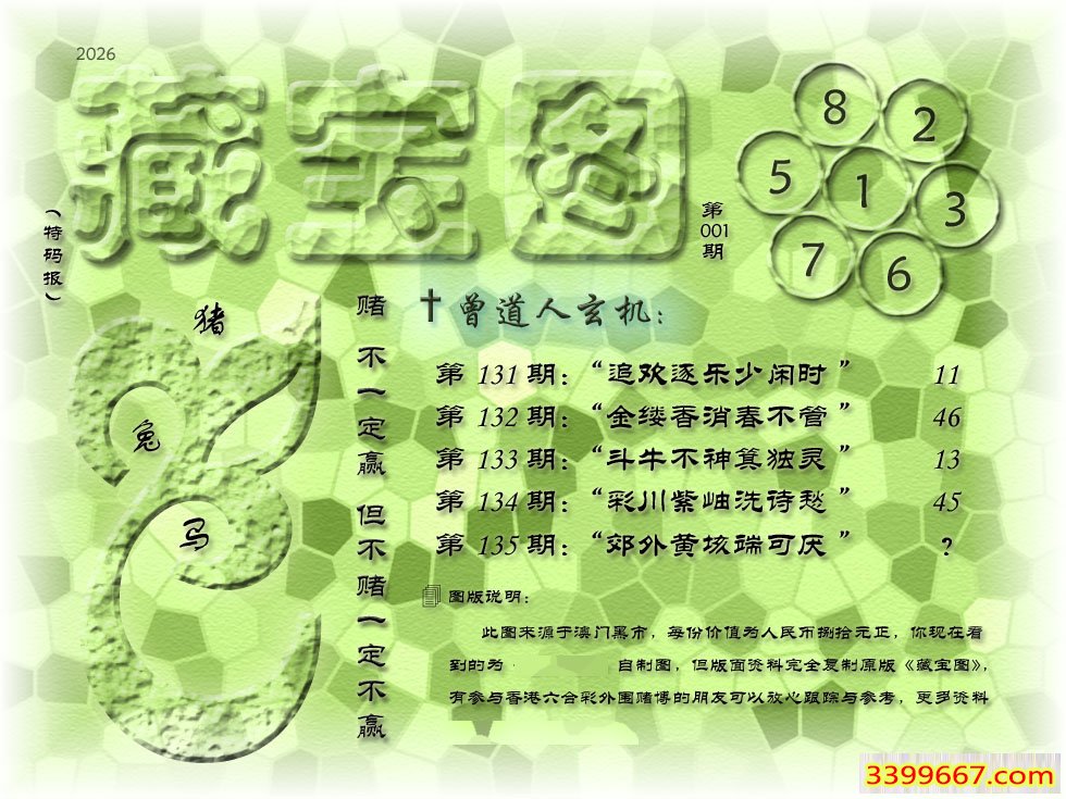001期藏寶圖 新:郊外黄垓端可厌 老:晴街春色香车立 禁:虎 禁:0尾